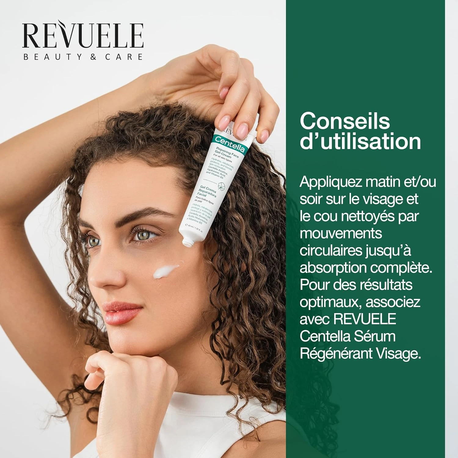 Conseils d’utilisation : Appliquer le matin et/ou le soir sur le visage et le cou préalablement nettoyés en effectuant de doux mouvements de massage jusqu’à absorption complète. Pour de meilleurs résultats, associer avec le sérum régénérant visage REVUELE CENTELLA.