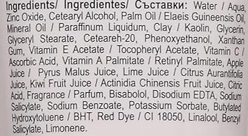 Ingrédients : Eau / Aqua, alcool cétéarylique, glycérine, urée, stéarate d’éthylhexyle, stéarate de glycéryle, palmitate d’isopropyle, Ceteareth-20, huile d’olive / huile de fruit Olea Europaea, diméthicone, collagène hydrolysé, allantoïne, provitamine B5 / panthénol, phénoxyéthanol, acétate de vitamine E / acétate de tocophéryle, palmitate de vitamine A / palmitate de rétinyle, vitamine C / acide ascorbique, jus de pomme / jus de Pyrus Malus, jus de citron vert / jus de Citrus Aurantifolia, jus de kiwi / jus de fruit d’Actinidia Chinensis, acide citrique, benzoate de sodium, sorbate de potassium, parfum / parfum, EDTA disodique, hydroxytoluène butylé / BHT, linalol, salicylate de benzyle, limonène, alpha-isométhyl ionone, citronellol.