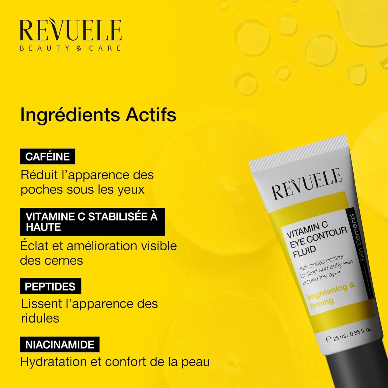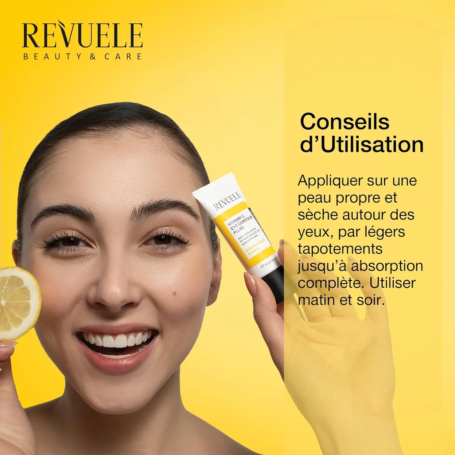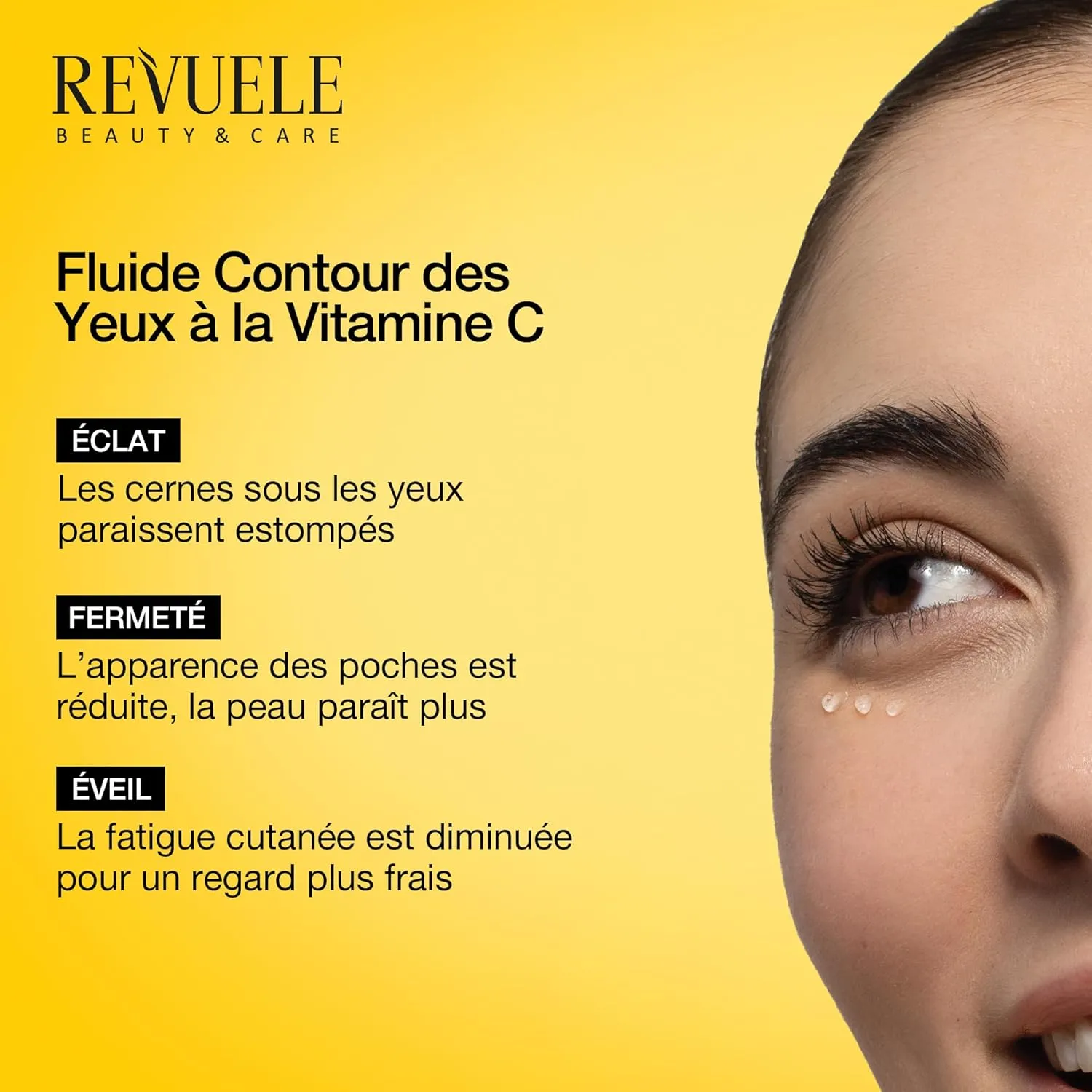 Le fluide contour des yeux à la vitamine C REVUELE est un puissant soin antioxydant et anti-âge qui cible la perte de fermeté et d’élasticité de la zone délicate du contour des yeux. Sa formule à base de vitamine C stabilisée contribue à atténuer les cernes et les signes de fatigue cutanée. Une utilisation régulière permet d’obtenir une peau d’apparence plus jeune, plus tonique et plus lumineuse.